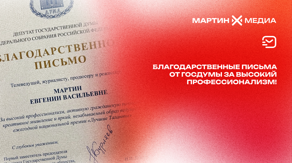 Ведущей премии «Лучшие таланты. Эксперты» при Торгово-Промышленной палате Санкт-Петербурга Евгении Мартин и Президенту Ассоциации «Лучшие таланты» Анастасии Демичевой вручили благодарственные письма от ГосДумы за высокий профессионализм!