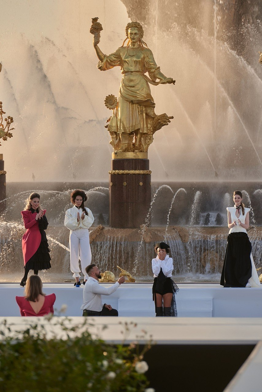 Коллекция «Императрица» была представлена в открытом пространстве у фонтана «Дружбы народов» на ВДНХ — под золотыми лучами заходящего солнца, в атмосфере, где современность встретилась с величием прошлого.
