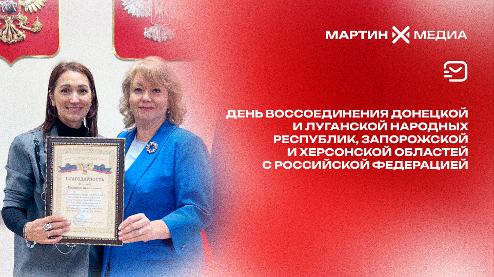 На торжественном мероприятии, посвященном 2-й годовщине Воссоединения Донецкой, Луганской Народных Республик, Запорожской и Херсонской областей с Российской Федерацией и приуроченное к этому историческому событию состоялось награждение добрых друзей, в числе которых и основатель информационного ресурса и телепрограммы, журналист Евгения Мартин.